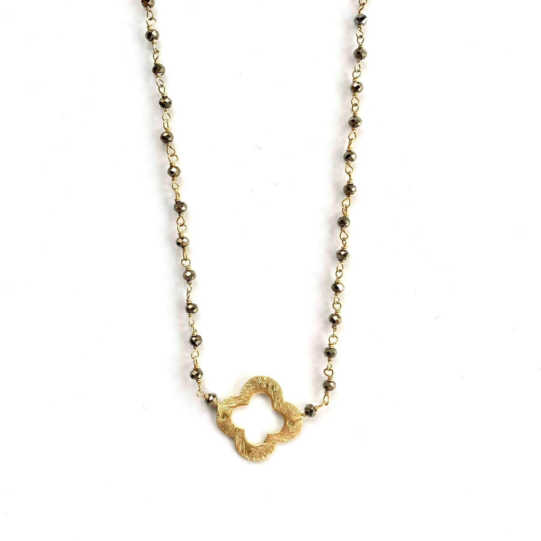 A feel good combination. We married the rich sparkle of natural pyrite with our gold brushed lucky clovers. Lighthearted and lovely. Gold vermeil. adjustable 16-18 inch chain. 10% goes to charity.