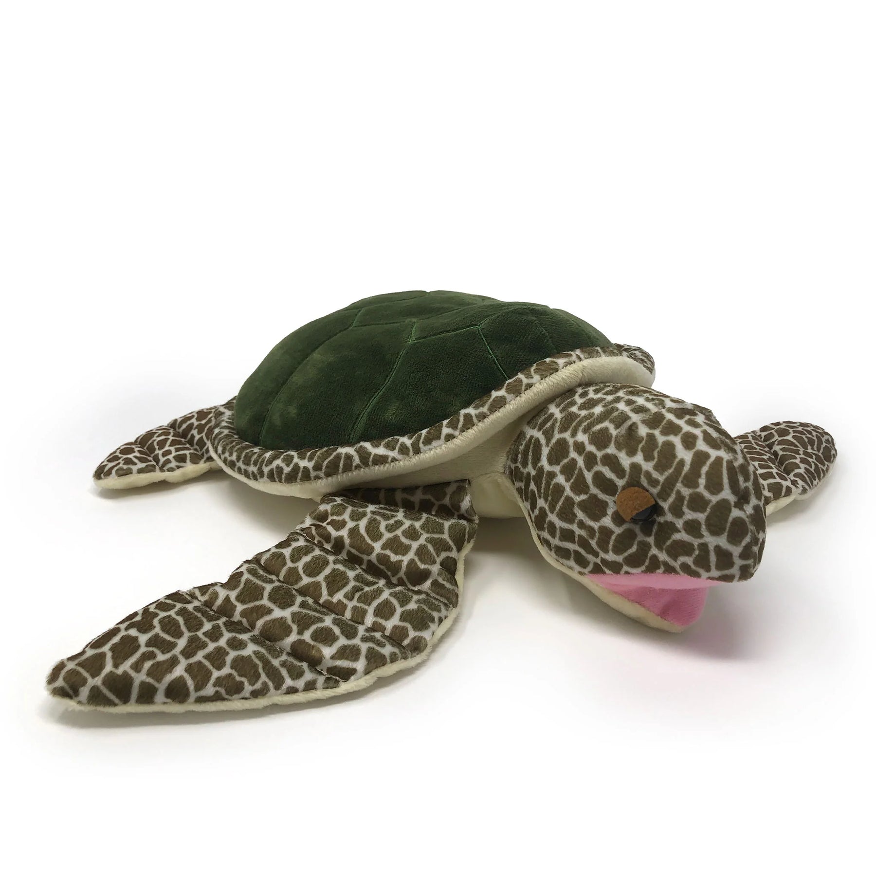 Gus, the soft and cuddle plush turtle toy, from the Turtle Trips storybook as well as the Turtle Tracks storybook, has his mouth open, ready to nibble fingers and graze on seagrass! Young ones love snuggling up with Gus while reading of his adventures in the bay where he meets curious children swimming nearby and a hatchling release about to take place. Gus features a unique 'puppet pocket' so children can put in their hand and act out the story told in our storybooks, or create a story from their own imaginations!
