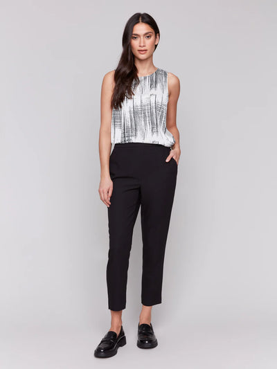 These chic cropped pants are perfect for any occasion. The pull-on style and crepe fabric offer both comfort and style, while the convenient pockets add practicality. The cropped length makes them ideal for pairing with your favourite spring footwear.