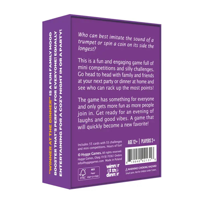 Who can best imitate the sound of a trumpet or spin a coin on its side the longest? This is a fun and engaging game full of mini competitions and silly challenges. Go head to head with family and fiends at your next party or dinner at home and see who can rack up the most points! The game har something for everyone and only gets more fun as more people join in. Get ready for an evening of laughs and good vibes. A game that will quickly become a new favourite! Age: 12+ Players: 2+ Play time: 15-45 min