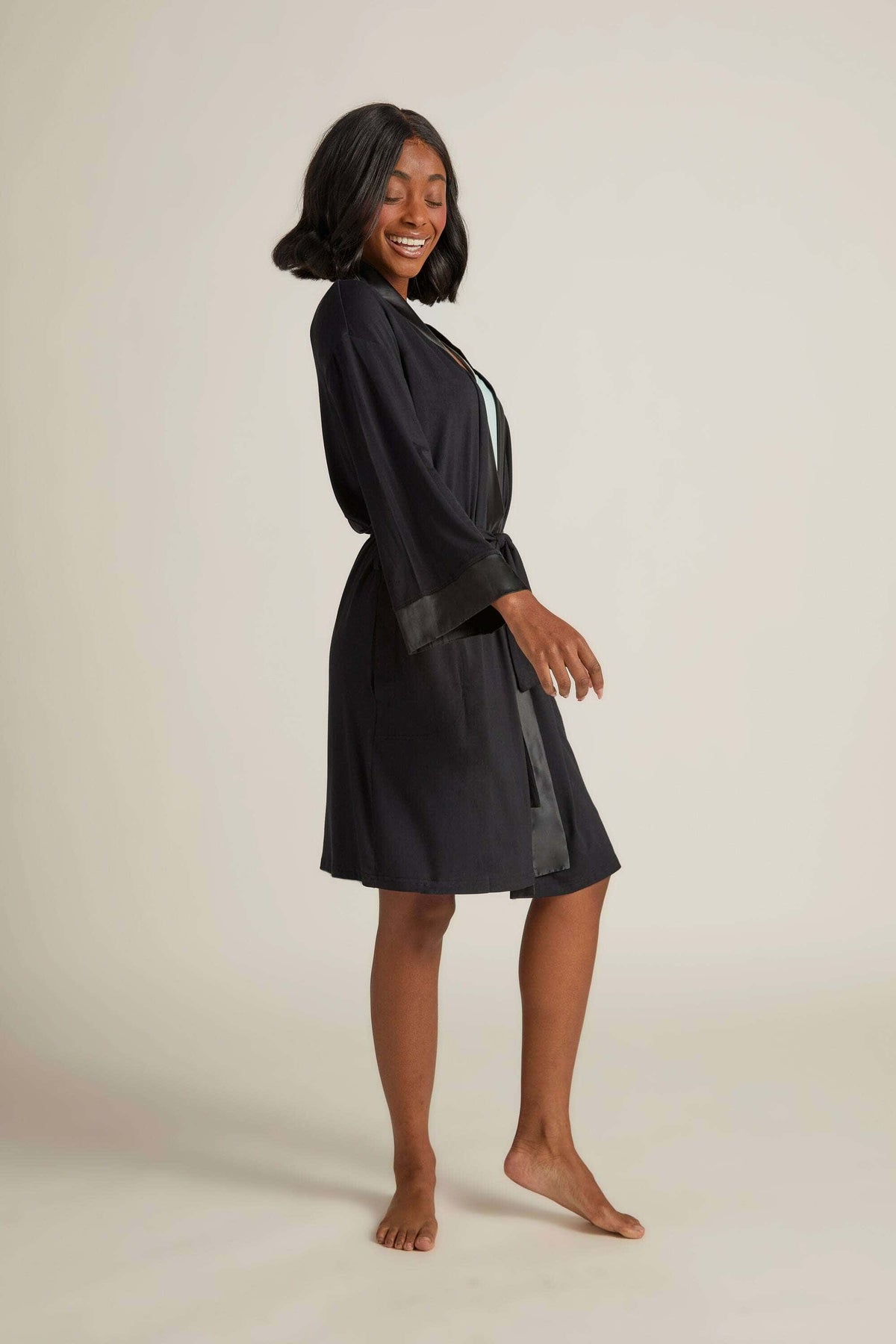 Elegant inspirations of a Kimono, elevated with the comfort of our signature bamboo. Finished with a wide satin trim and a waist tie.