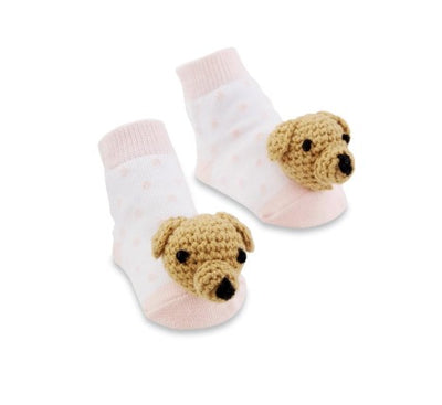 Share the puppy love with our Blue dog rattle toe baby socks. The cotton hosiery striped blue dog baby socks. The socks feature a white background with blue details. The end of the toes feature dimensional crochet puppy rattles at toes. The socks feature blue trimming on the edges.