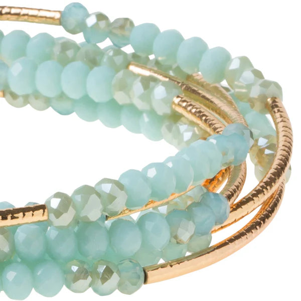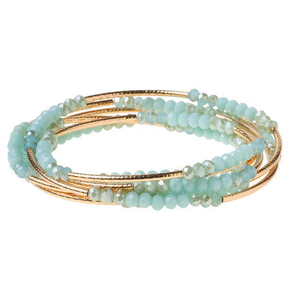 The Scout Wrap is made with crystal beads and etched metal findings. It can be worn wrapped 6-7 times for a bracelet and 1-3 times for a necklace. Displayed on beautiful cards and personalized with inspiring quotes they make a great gift!