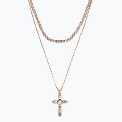 Necklace-Gold Pearls + Crystal Cros