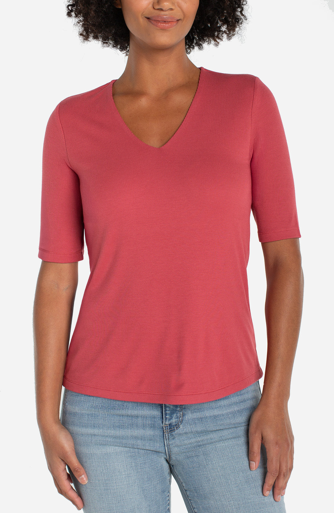 Liverpool Double Layer V-neck Rib Knit Top - Garnet Rose