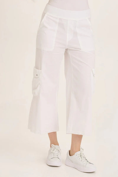 A pull-on elastic jersey waistband, plentiful exaggerated cargo pockets, a raw-edge hem, and antique brass hardware all join together in this capri style.