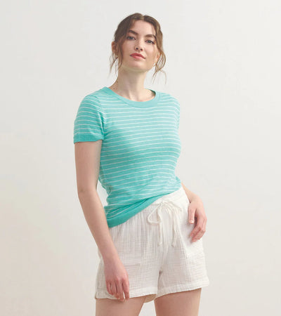 The Simone Tee in Teal Stripes is a timeless addition to any wardrobe. Made from a cotton and viscose blend, it offers a lightweight fine-gauge knit, breathable comfort, and a soft touch. The classic stripe design ensures effortless styling for a refined casual look. Pair it with denim or a skirt for a polished yet relaxed outfit.