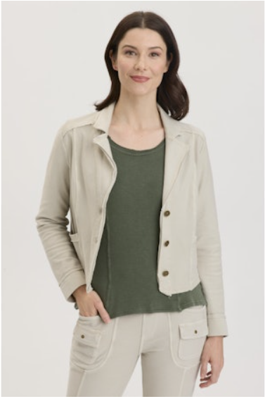 This slightly cropped blazer features raw edge details, three button closure, front pockets and a stretchy comfort knit.