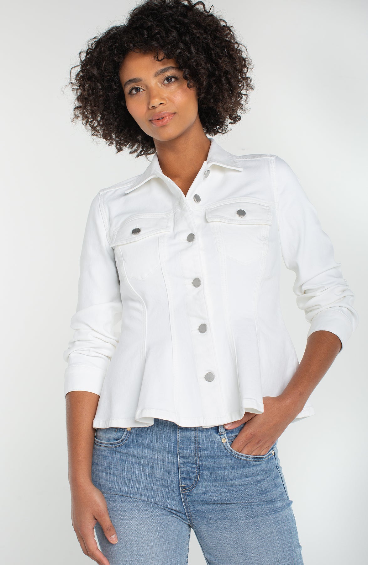 A fresh take on the classic trucker. This fit-and-flare jacket creates a defined shape with a soft sweep through the waist, blending structure with effortless movement. Finished with timeless flap pocket detailing for a look that feels both modern and iconic.