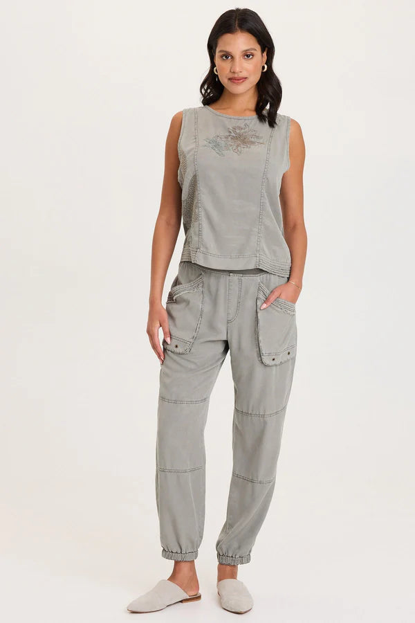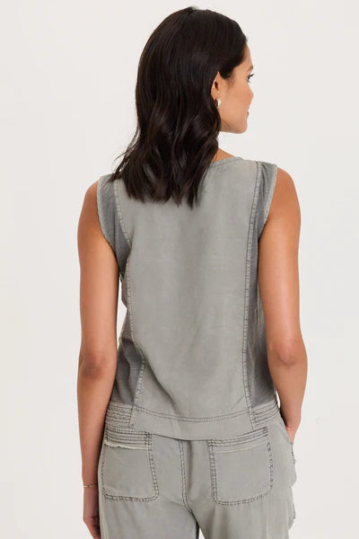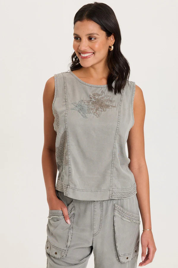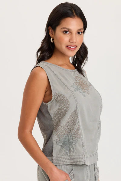 XCVI Davies Embroidered Twill/Jersey Tank in Magnetic Grey Pigment