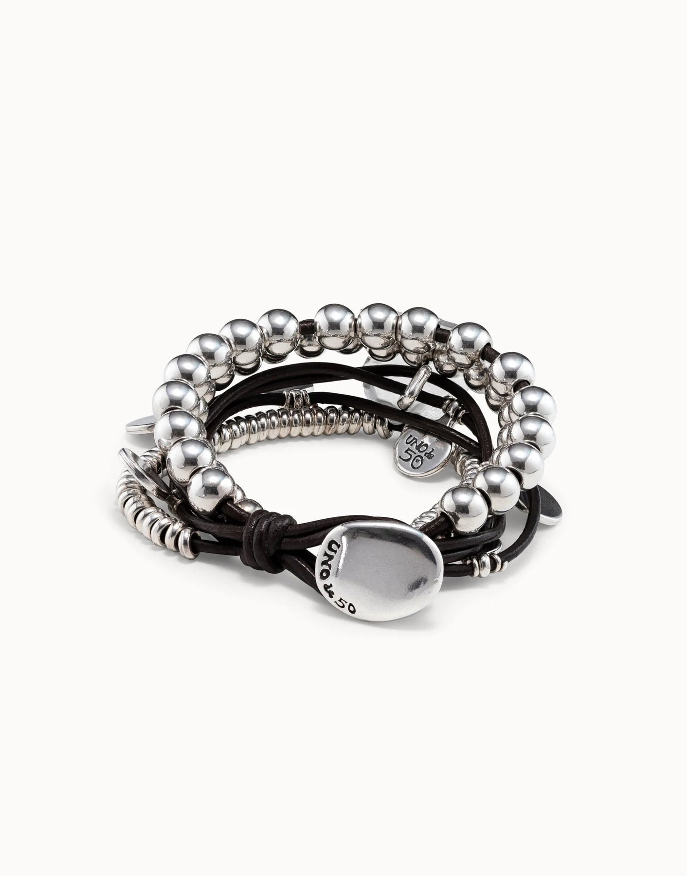 Bracelet with a sterling silver-plated metal design, combining rows of leather and metal pieces with white synthetic pearls and the brand's logo. This jewel is handmade in Spain with traditional goldsmith techniques.