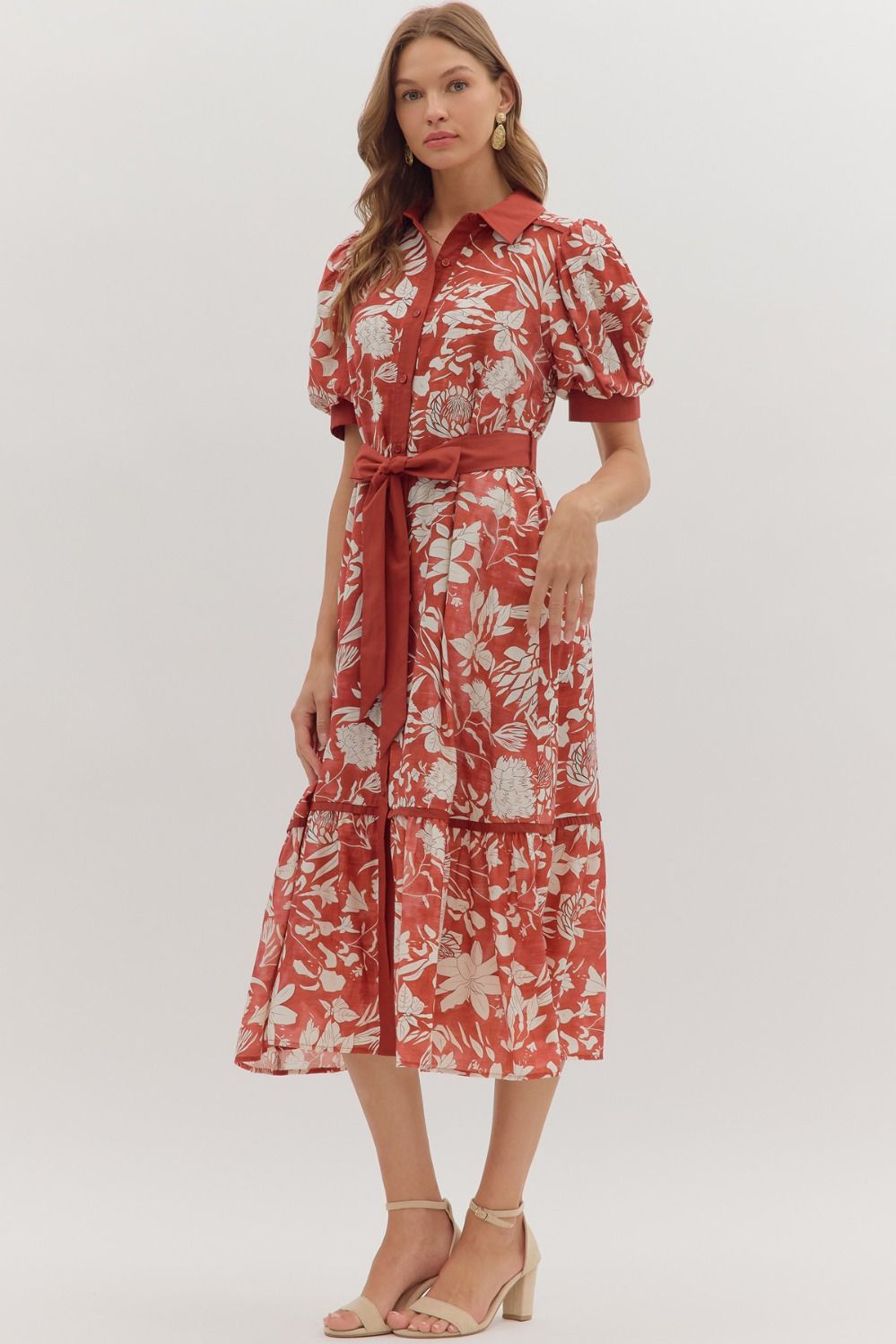 Floral print short puff sleeve tiered midi dress featuring button front and collared neckline. Self-tie at waist. Side pockets. Lined. Woven. Non-sheer. Lightweight.