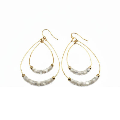 These refined, slender earrings showcase our latest must-have Heishi beads in white, highlighted by four 3mm gold-filled accents. Their double teardrop shape imparts an elegant flair, perfect for elevating any ensemble with subtle sophistication.