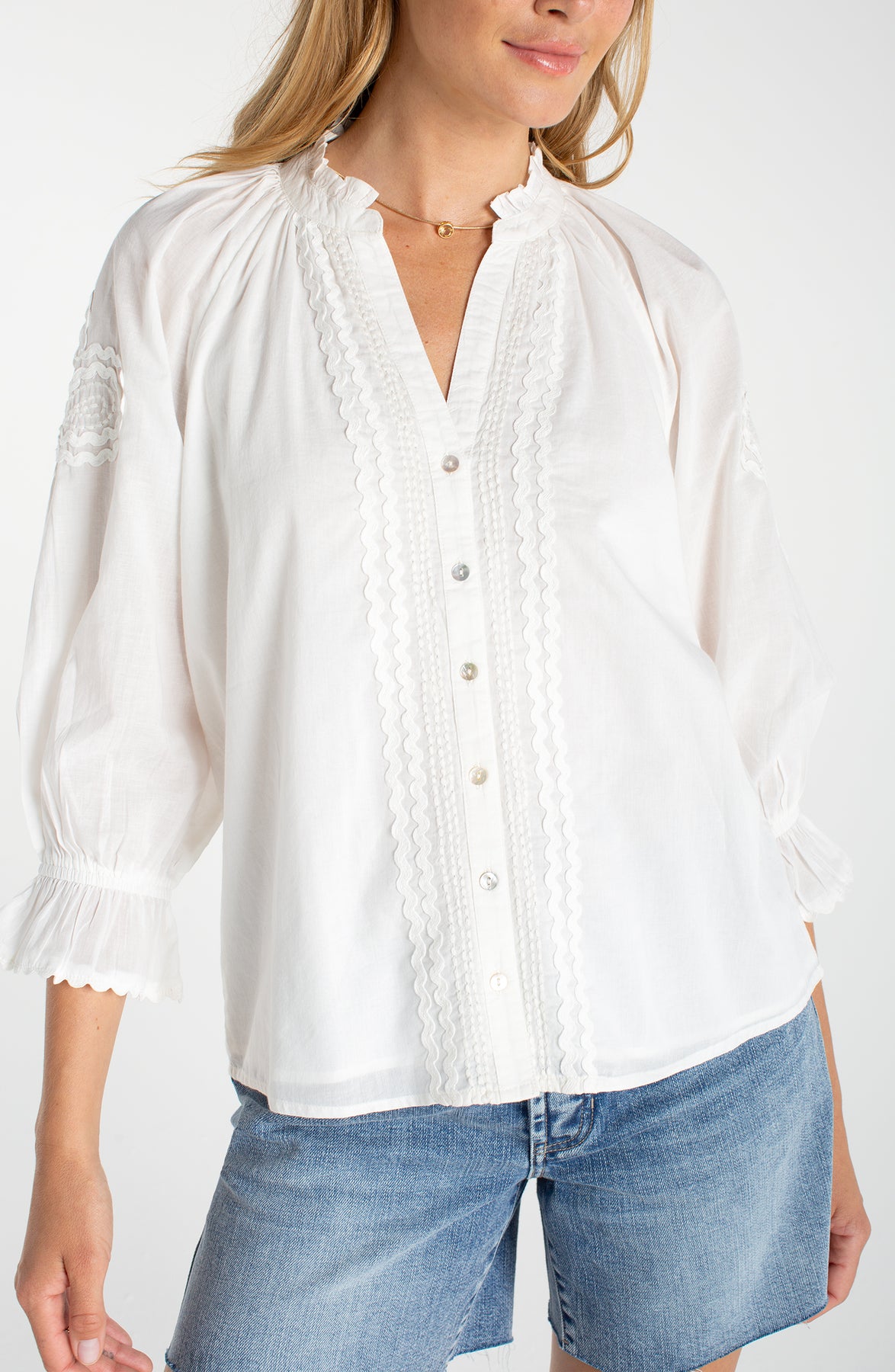 Liverpool 3/4 Sleeve Button Front Wove Top w/ Embroidery - Bone