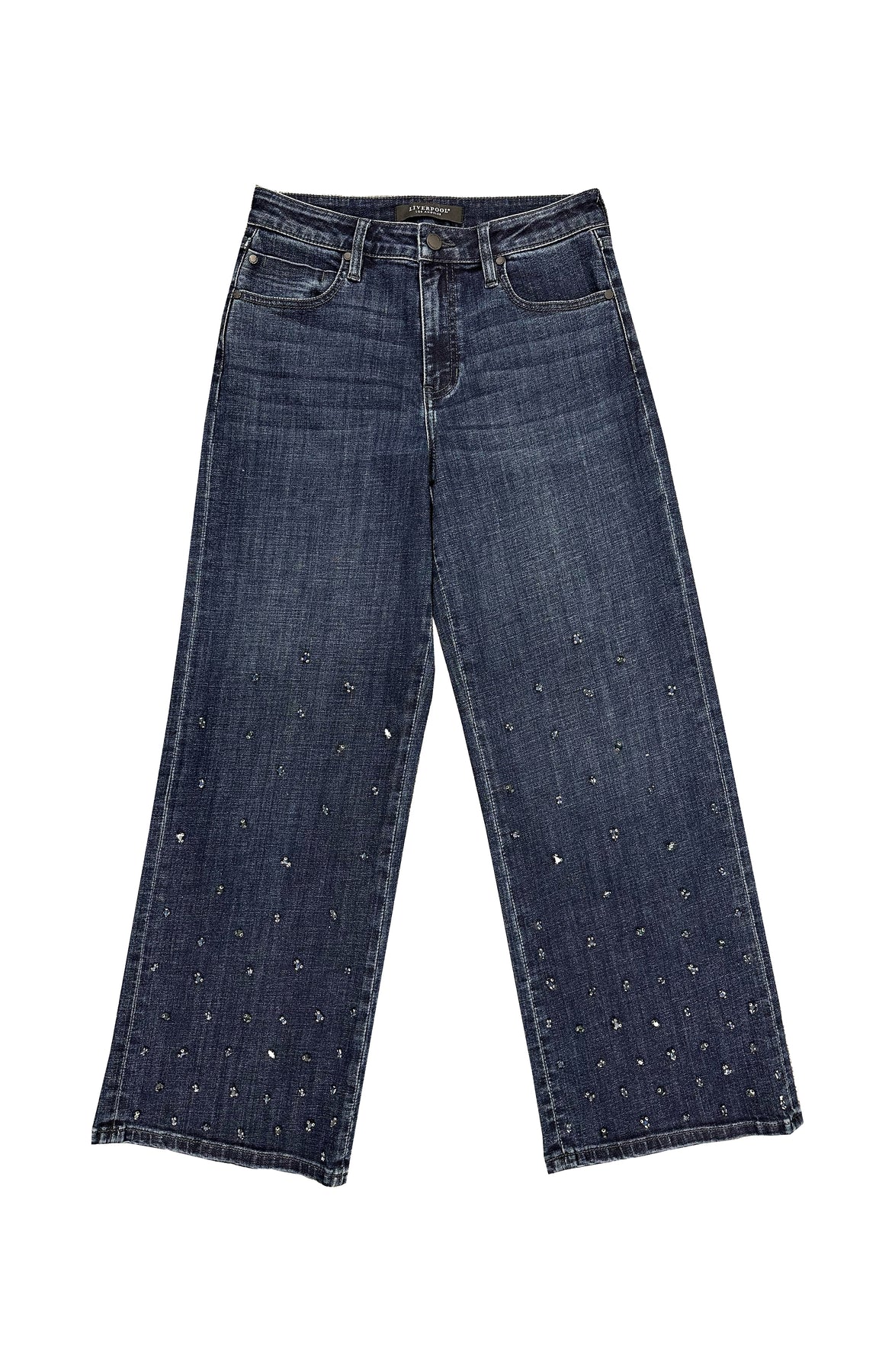 Sleek, confident, and illuminated by subtle sparkle. This rich indigo wide leg features tonal crystal accents that catch the light with understated movement, reminiscent of city lights after dark. With its soft stretch and flattering drape, it’s denim designed for elevated moments: effortless, modern, and undeniably chic.