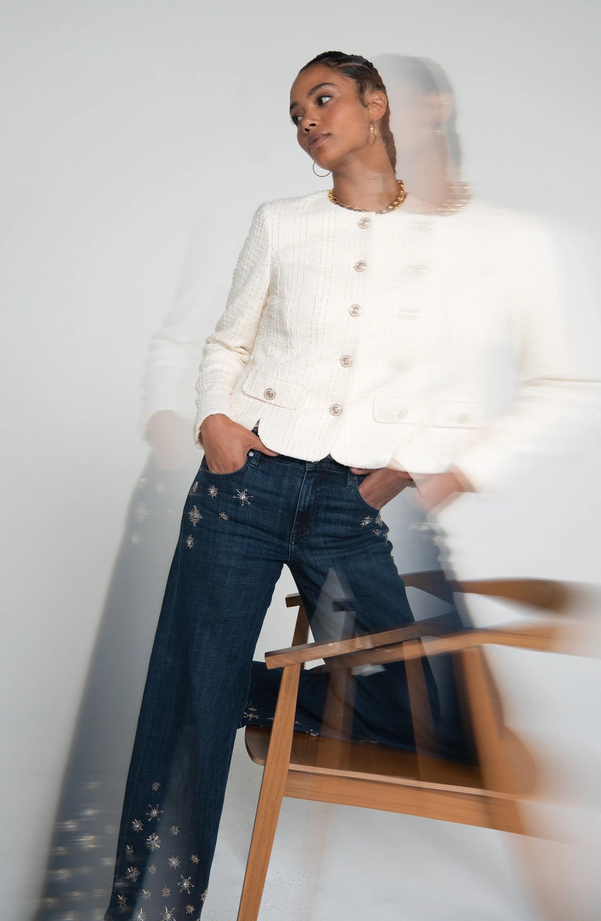 n expression of understated glamour. This deep indigo wide leg is adorned with light-catching crystal clusters that create a refined shimmer across the leg. Designed to flatter with our signature soft stretch and elevated structure, it brings a touch of luxury to everyday denim.