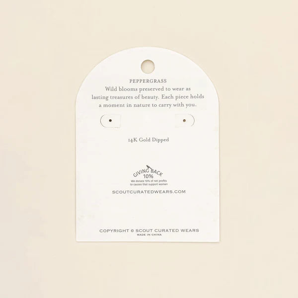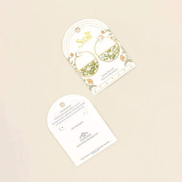 Wild blooms preserved to wear as lasting treasures of beauty; each piece holds a moment in nature to carry with you. Each hoop earring features natural, pressed flowers sealed with 14K gold dipped accents.