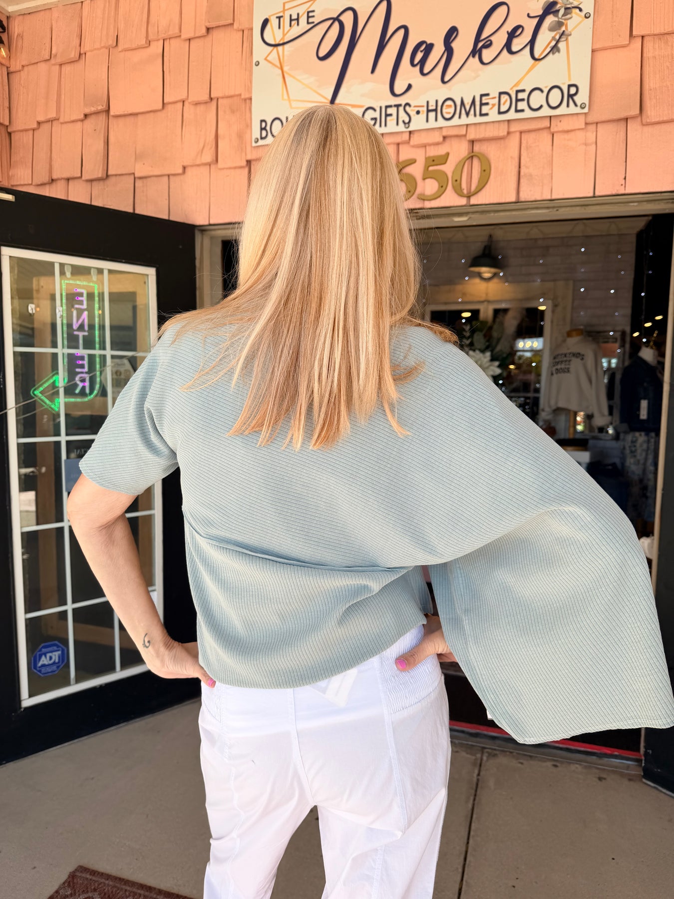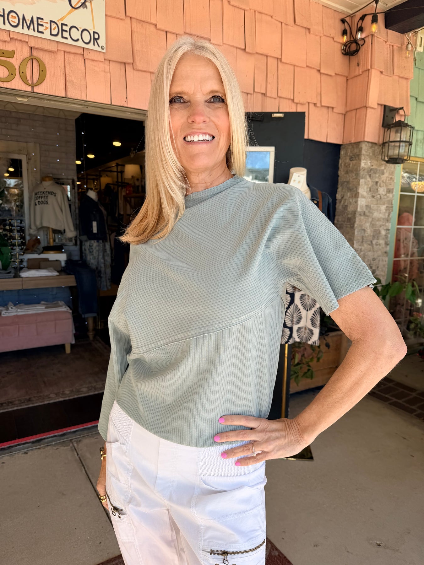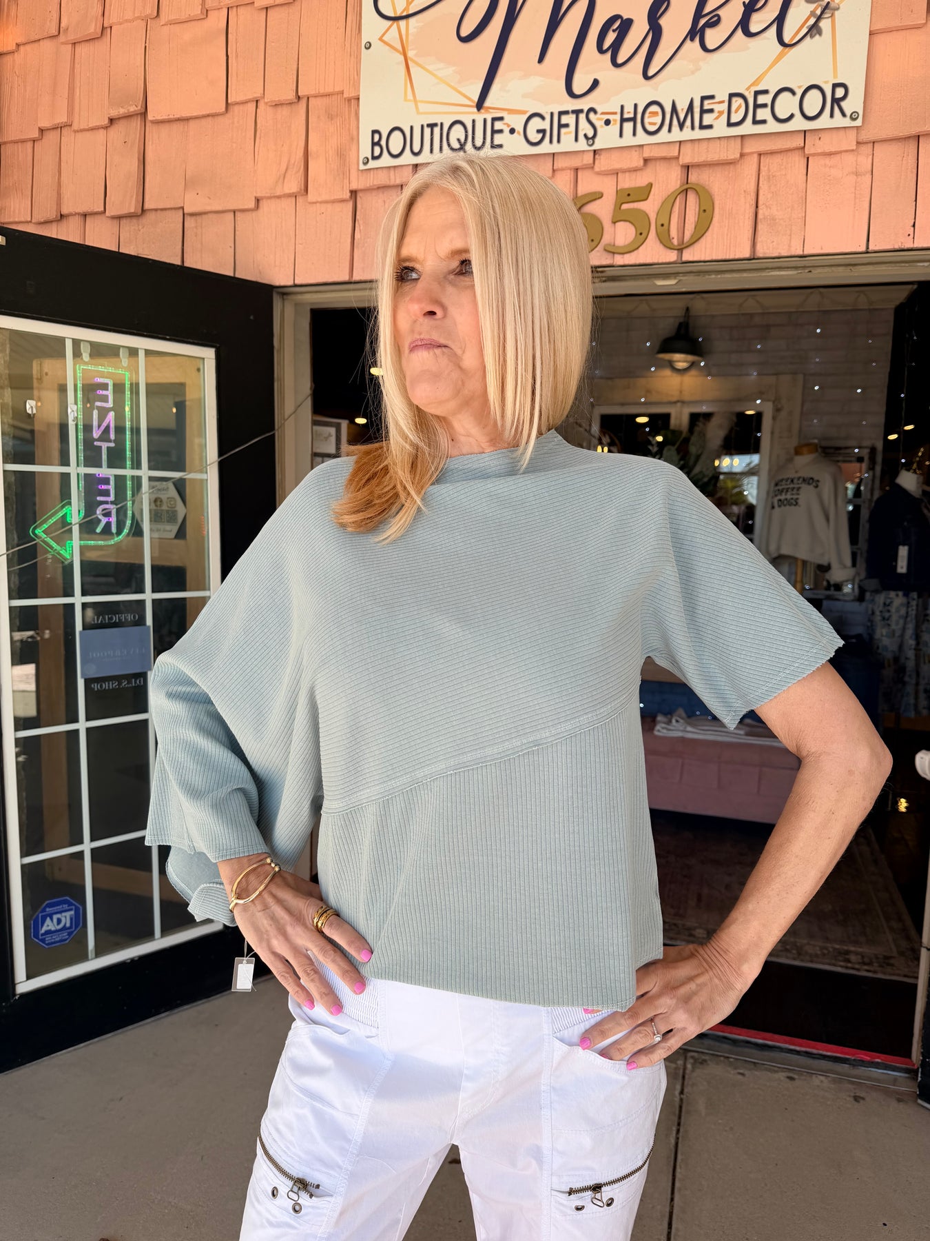 Have the best of both worlds with this fun top! Asymmetrcal sleeves create a flowing sleeve on one side with a simple short sleeve on the other.